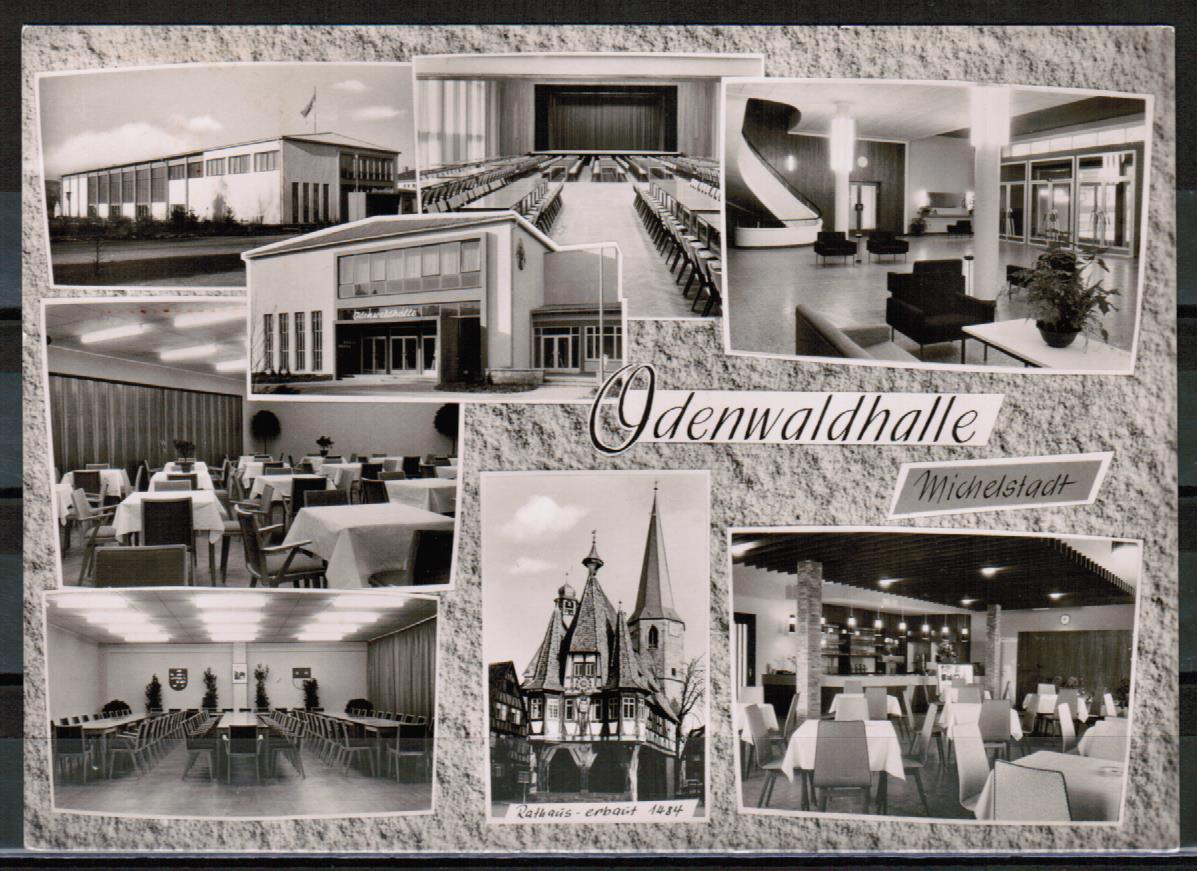AK Michelstadt, Odenwaldhalle, um 1960, als Stempel-Karte mit dem Sonderstempel zum erscheinen der Rathaus-Briefmarke 1884 benutzt - Marke aber entfernt ... - .. die bösen Sammler ... !
