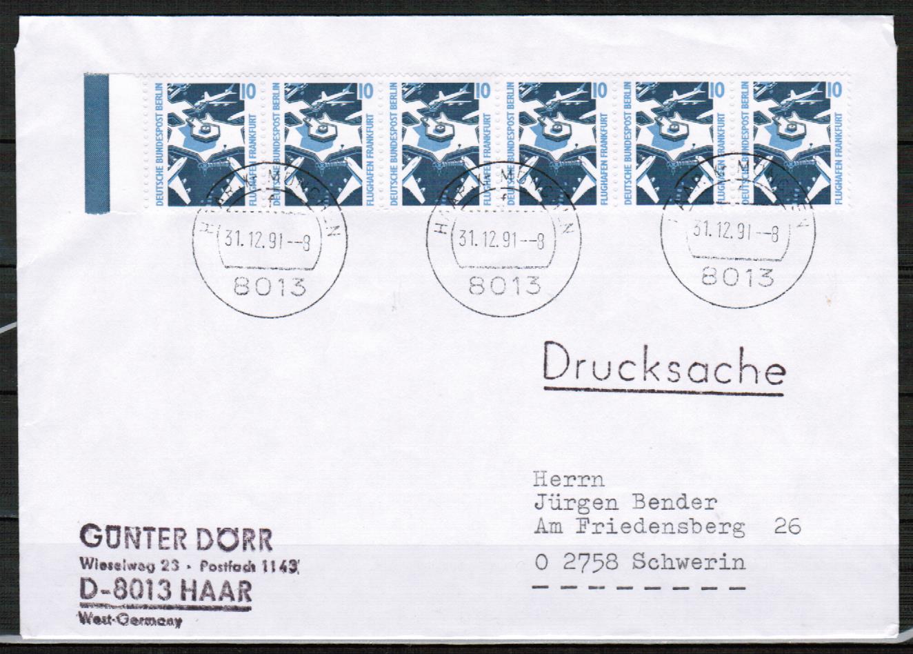 Berlin 798 als portogerechte Mehrfachfrankatur mit 6x 10 Pf Sehenswürdigkeiten aus Bogen mit Bogen-Rand auf Inlands-Drucksache mit Bund-Stempel vom letzten Gültigkeitstag: 31.12.1991. Brief mit Bund-Stempel - rückseitig offen - und in einwandfreier Erhaltung !