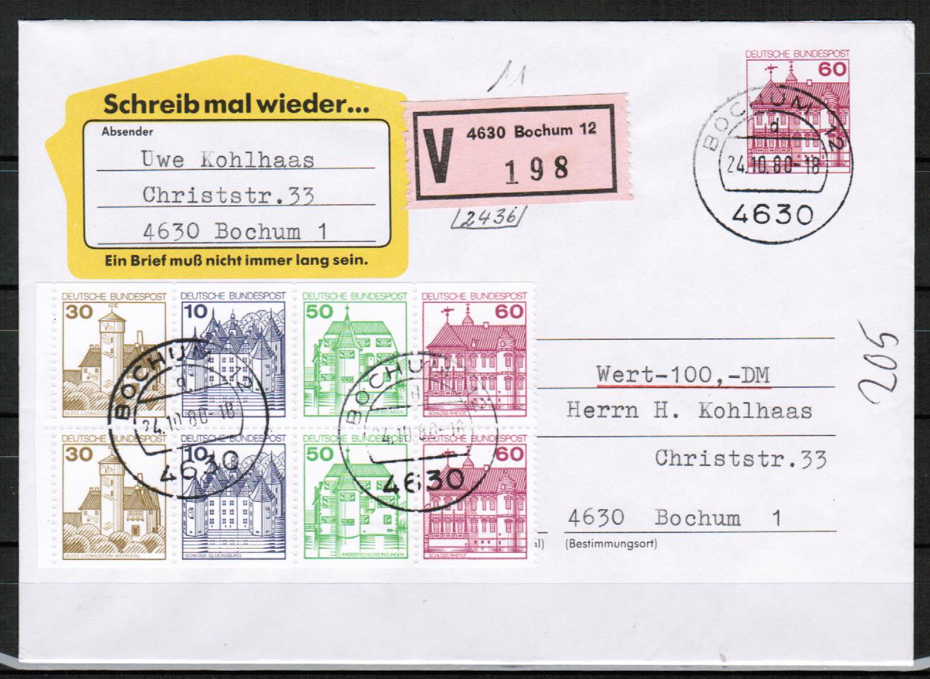 Bund B+S-Heftblatt zu 3,- DM mit roter 60 Pf Burgen und Schlösser - Marke als Zusatz auf 60 Pf B+S - Ganzsachen-Umschlag als portogerechte Heftblatt-Mischfrankatur auf Inlands-Wertbrief bis 20g von 1980. Brief rückseitig mit Ankunftsstempel - in einwandfreier Erhaltung !