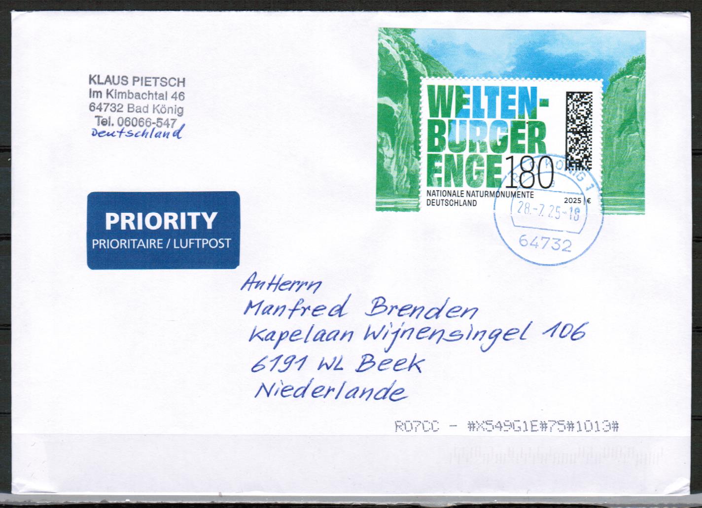 Bund 3915 als portogerechte Einzelfrankatur mit 180 Cent Weltenburger Enge Einzelmarke aus Block auf Auslands-Brief 20-50 Gramm aus der Gebührenperiode von 2025-2026 in die Niederlande. Brief vorderseitig mit roter und schwarzer niederländischer Codierung - in einwandfreier Erhaltung !
