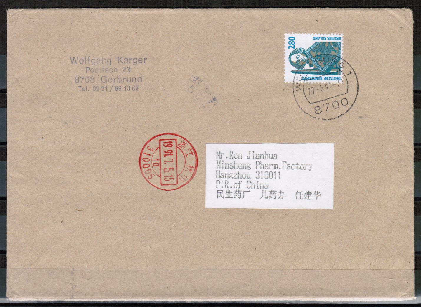 Bund 1381 als portogerechte Einzelfrankatur mit 280 Pf Sehenswürdigkeiten aus Rolle auf Auslands-Brief 50-100 Gramm von 1991 nach China. Brief vorderseitig mit chinesischem Ankunftsstempel - in einwandfreier Erhaltung !